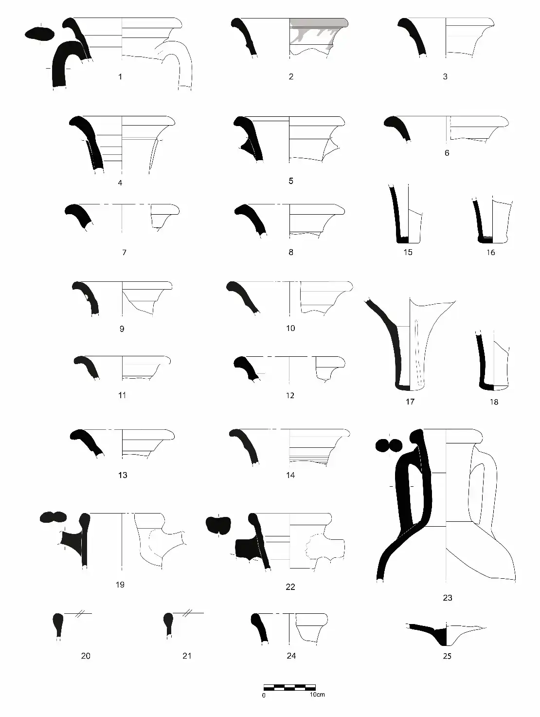 Additionally, the assemblage includes a small but noteworthy presence of Baetican oil and wine containers: two Dressel 20 amphora toes and a probable Haltern 70, both likely products of the Guadalquivir Valley have been documented (Fig. 1: 25). Alongside the Baetican group, two rims of Dressel 2–4 amphorae from Laietania in northeastern Spain were identified (Fig. 1: 22–24). In addition, seven Dressel 2–4 amphorae with clearly recognizable Italic fabrics, probably from the Bay of Naples, were recorded (Fig. 1: 19–21). A resin lining is preserved on the interior of both the Laietanian and Italic examples. Other containers exhibit flat ring toes and are tentatively interpreted as Italic amphorae from Forlimpopoli. However, this attribution remains provisional pending ongoing study and fabric characterization.