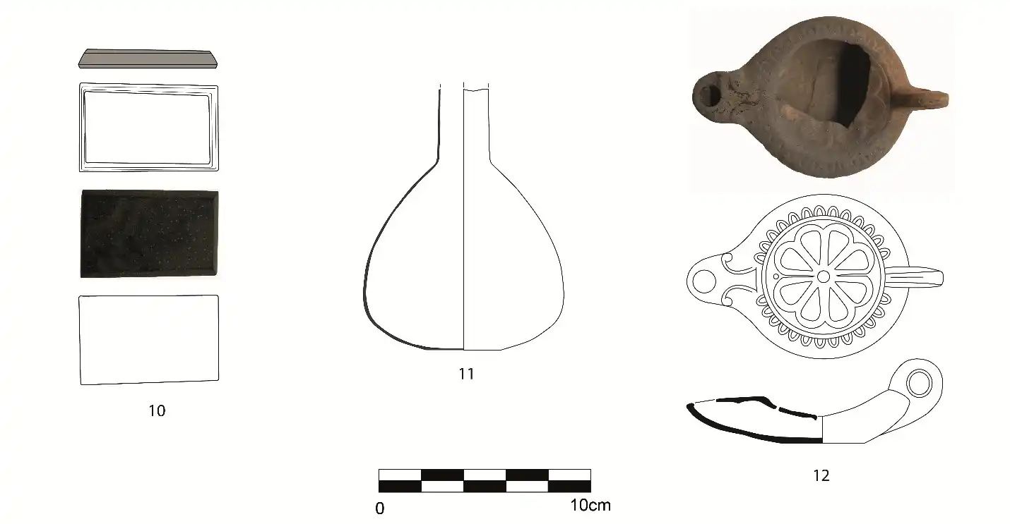 We also recorded a small trapezoidal marble tablet of dark grey stone with white veining (8.5 × 5.5 × 1.2 cm), bevelled on all four sides (Fig. 10:10). Such tablets, known as coticulae, were used to prepare cosmetics and to mix creams, eyedrops, or ointments (Pliny, NH 31.9.100; 22.157; Isidore, Orig. 9.11.7).