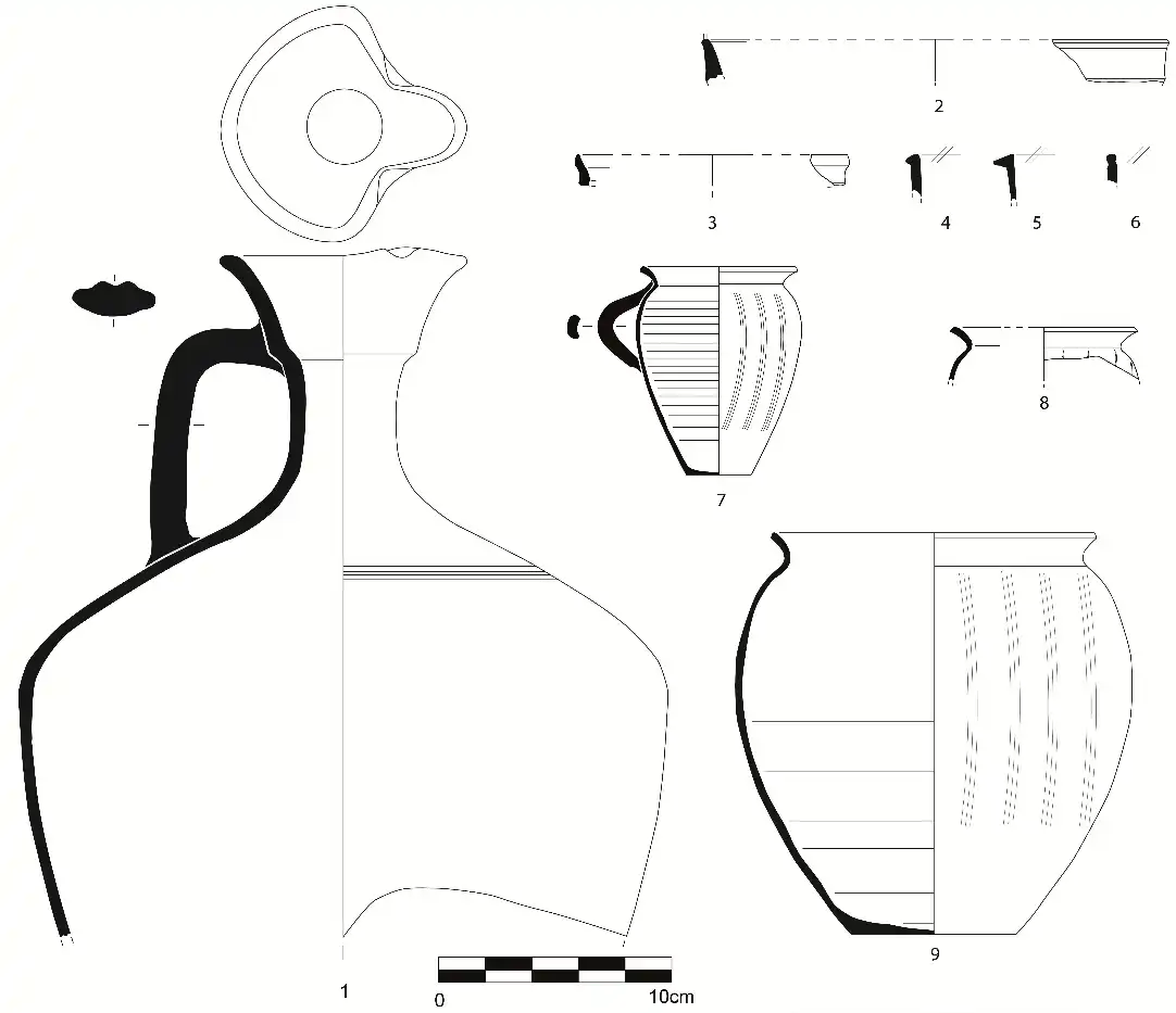 Beyond the amphorae, the assemblage includes a substantial corpus of coarse-ware pottery (Fig. 2:1) and thin-walled vessels. Notably, a complete profile of a comb-decorated Mayet 24.4— a globular cup dated to the early Augustan through Neronian periods—was recovered (Fig. 2:7–9). Several bowls with sandy decoration of Mayet 33/35, dated between the last third of the 1st century BC and the beginning of the Claudian period, were also present. It is worth recalling that thin-walled sherds with barbotine decoration, characteristic of the Claudian period, were recorded in the 1960s by Claude Domergue.