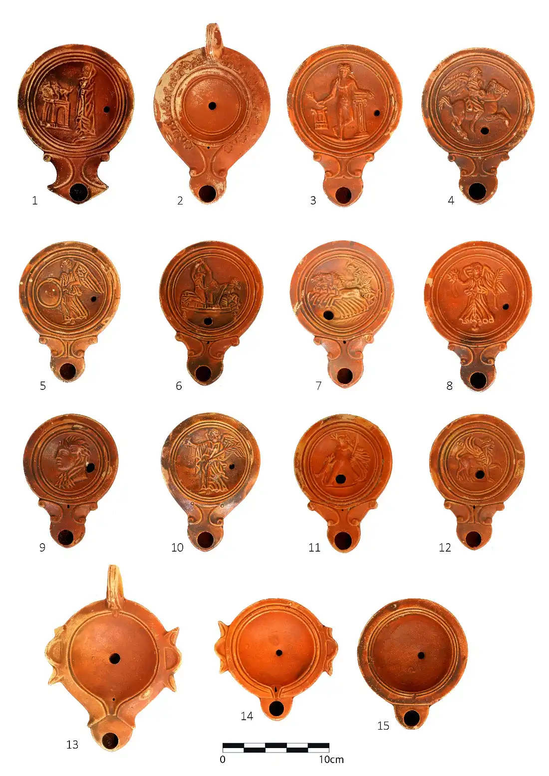 Typological analysis distinguishes four morphological groups, encompassing a broad decorative repertoire that includes mythological scenes, everyday activities, and animal and floral motifs. A substantial number bear an in planta pedis stamp of C(aius) CLOD(ii), which scholars associate with a workshop in central Italy. Following Ricci’s chronology, these lamps are dated to the middle of the first century AD.