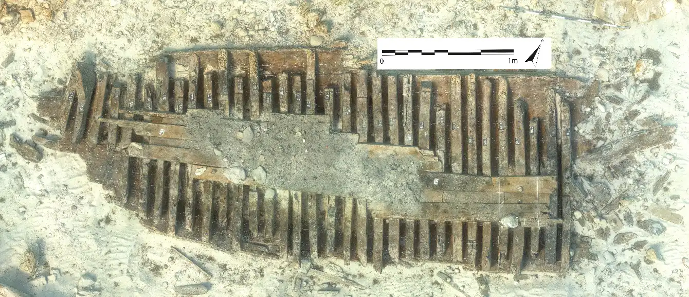 Reconstructing the vessel’s route is more challenging. The ship was likely built in central Italy, as suggested by the TELESFORUS marks on frame 111—a cognomen of Greek origin but especially attested in central Italy—incised on structural timbers during construction and never intended to be visible (see section on shipbuilding). The cargo most plausibly reflects the itinerary of the final voyage, linking Baetica with the Balearic Islands and Italy (in either direction). Baetican exports are represented chiefly by amphorae containing salted-fish products, as well as wine and oil; the Italian contribution is dominated by oil lamps, Italic Dressel 2–4 amphorae, and the pumiceous tephra (pozzolana) with Campi Flegrei geochemical signatures.