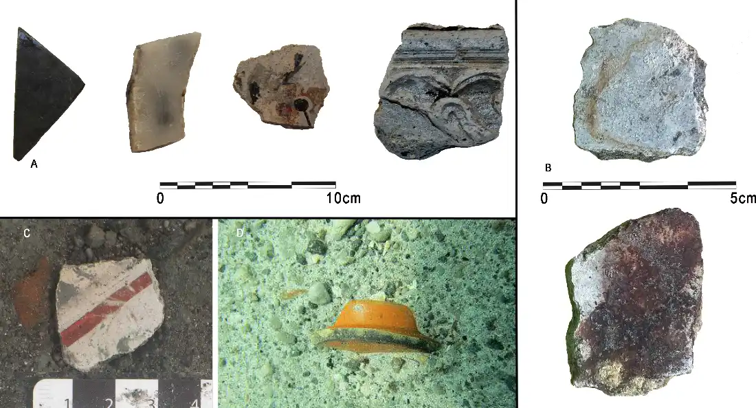 On the ceiling, we recorded an olive-grey deposit of earthy sand (Figs. 4–5) containing numerous small fragments of building material and ceramic sherds (Fig. 6). These include lime-mortar mouldings decorated with geometric motifs; marble and slate fragments associated with opus sectile pavements; bricks with adhering mortar; white tesserae; pieces of opus signinum; tiles; and a wide variety of polychrome plaster.