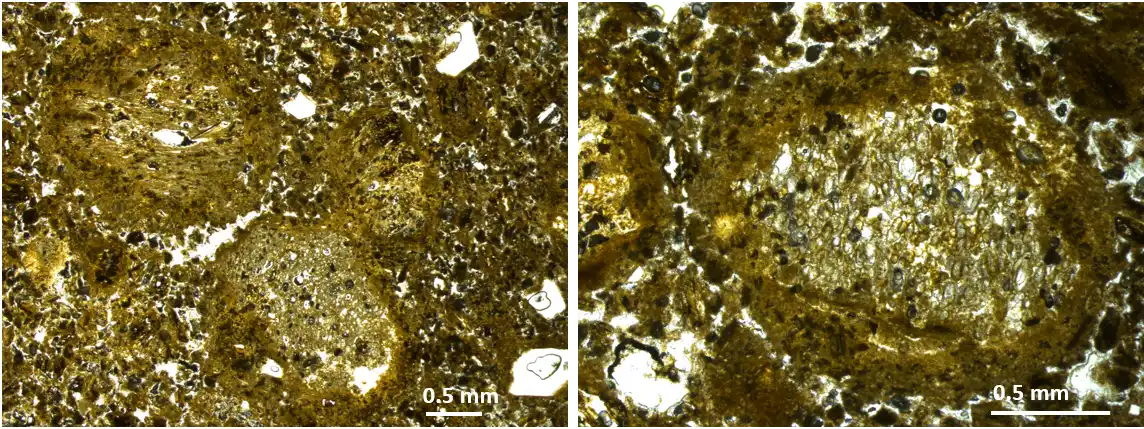 Petrographic micrographs of a thin section of the loosely consolidated deposit (Fig. 7) confirmed this hypothesis, revealing that the tephra is composed of altered lapilli-sized pumice armoured with fine ash. The altered vitric matrix of the deposit has high porosity and contains sanidine and clinopyroxene crystal fragments; there are zeolite minerals on pore surfaces. These characteristics are similar to many pumiceous deposits from the central Italian volcanic districts that may have been used as pozzolana in Roman marine concretes (de Architectura 5.8). Therefore, the volcanic tephra can be identified as pozzolana, and it would be a valuable material. A detailed analysis of this unique deposit, which appears to have helped preserve the vessel’s wooden hull against decay in the marine environment, is currently being published as part of a broader study on ancient Roman concrete structures fabricated with reactive volcanic aggregates.