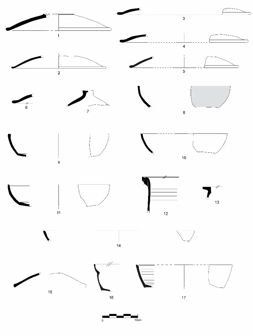 During excavation, a number of items that were not part of the ship’s commercial cargo, and that most likely belonged to the crew, were recovered. These comprise personal objects and tools with specific, everyday functions on board. First, several ceramic vessels show clear use-wear, including cooking wares with surfaces blackened by soot. Among these are Italic cooking wares, notably pans with a grooved rim (Form 4 / Vegas 14; Fig. 8: 8–11), various lids/plates (Fig. 8: 1–7), the rim of a caccabus (Fig. 8: 13), and the rim of a Pompeian red ware casserole dated between the Augustan period and the end of the first century AD (Fig. 8: 14). In addition, several sherds of North African cooking wares (Fig. 8: 16–17), dated from the reign of Tiberius to the first half of the second century AD, were identified, along with multiple lid/plate rims.