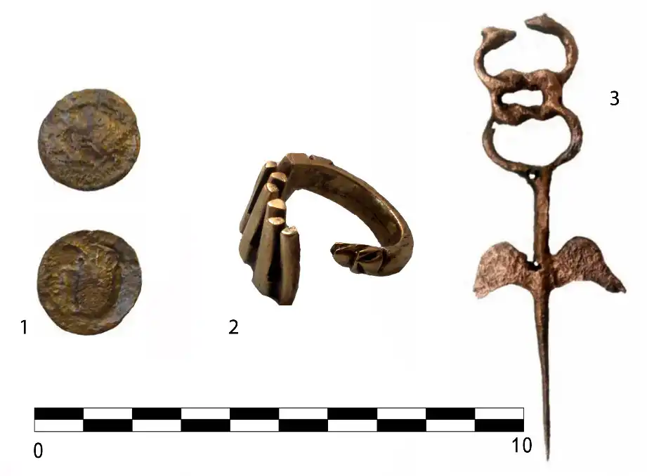 During the 2018 season, we found a metal object roughly 10 cm long whose form suggested a connection with the vessel’s remains. Following initial preventive conservation, the piece proved to be a small bronze caduceus, with Mercury’s wings at the lower end and two intertwined, confronting serpents at the upper end (Fig. 9:3). The caduceus, an emblem associated with traders and messengers, is a common motif on decorated lead stocks.