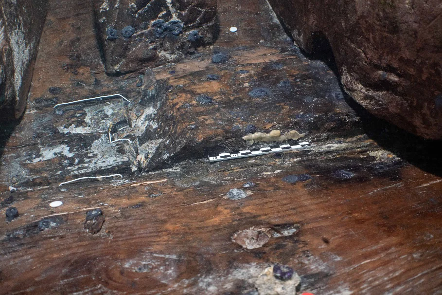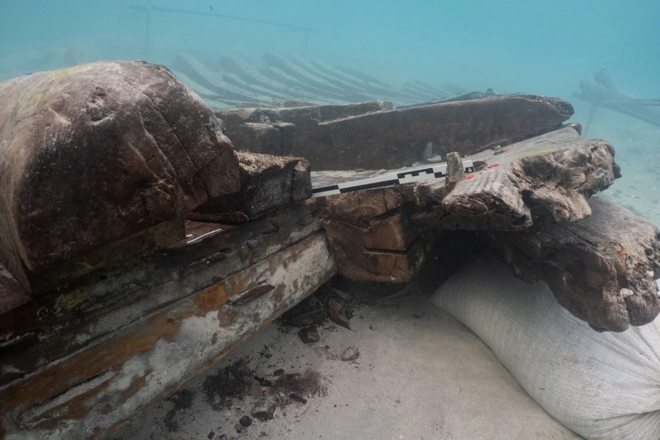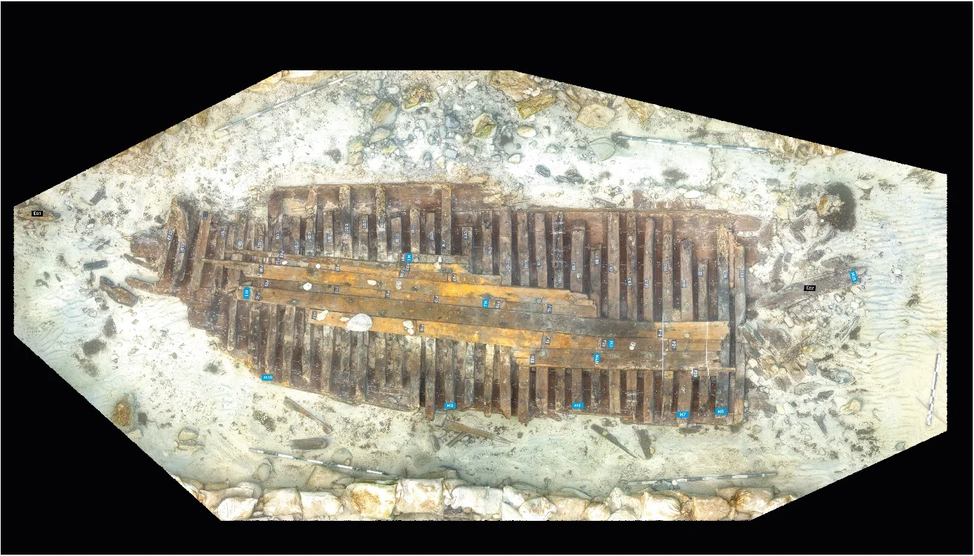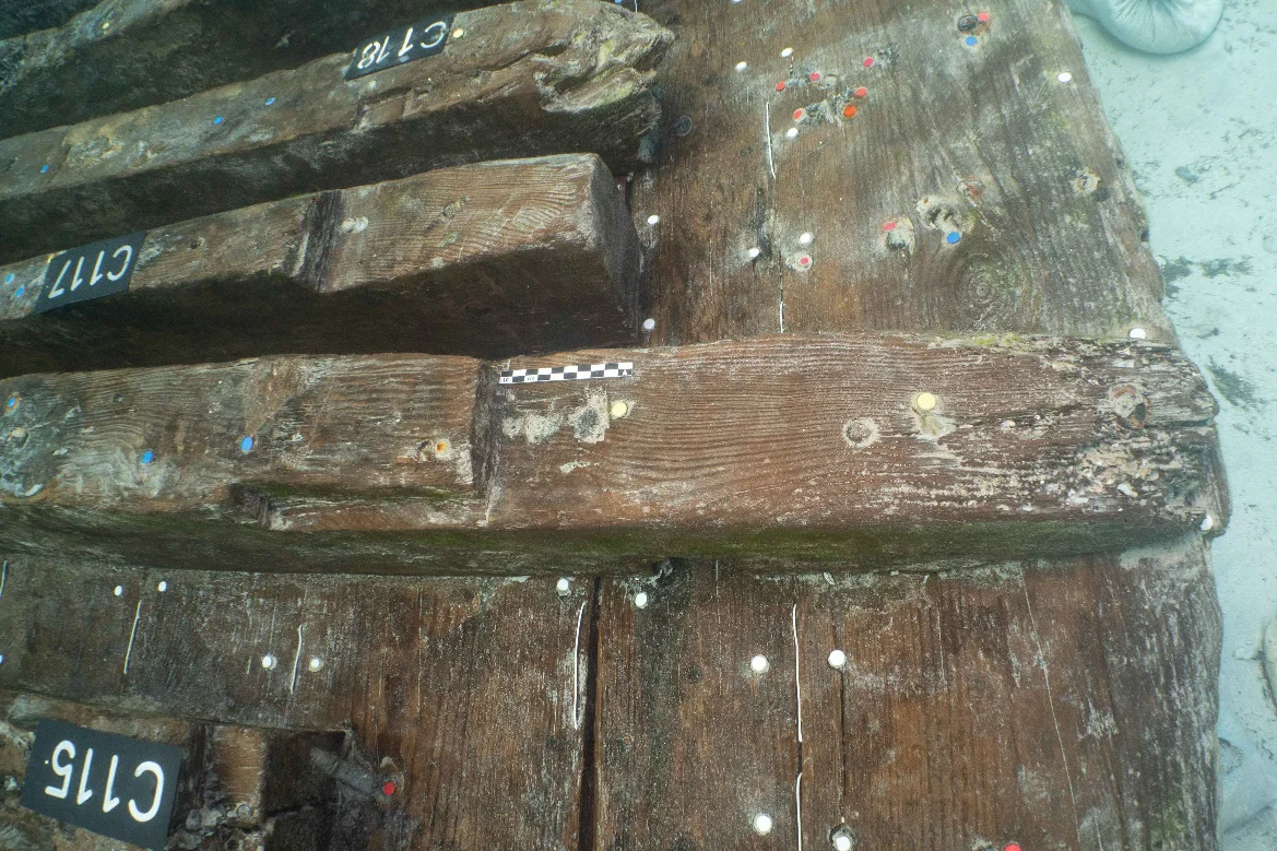 The wreck fragment is oriented east–west and is preserved over approximately 8.5 m in length and 3.35 m in width. It comprises 32 frames and 13 strakes and roughly corresponds to the forward quarter of the vessel (Figure 1).