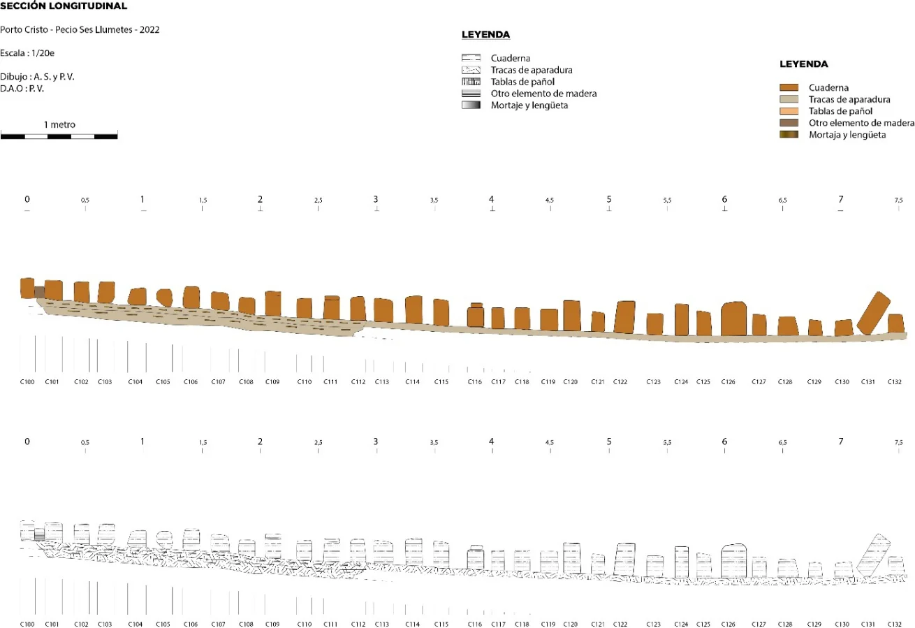 Assuming the mast-step socket lies between C116 and C112, the distance between the preserved end of the hull at C132 and the mast would be 5 m. Given that the main mast of a Roman ship is located in the forward third of the vessel and that the shape of C131 indicates the upward sweep of the hull toward the stem is already well advanced (beginning shortly after the forefoot), we can project an additional length of 10 m toward the stern. Taking the forward and aft overhangs into account, the length of the Ses Llumetes vessel should be estimated at, at most, around twenty meters. With a keel height of 26–28 cm, this vessel was well suited to coastal navigation in shallow waters or estuarine sailing, though its operating range may well have extended to the open sea.