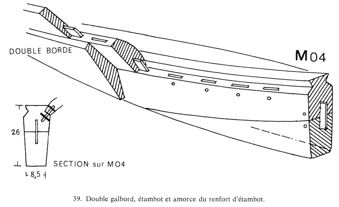 This feature is also found on the Bou Ferrer wreck, contemporary with Ses Llumetes, and likewise—though differently—on the Republican-period Cavalière wreck. On the latter, the double garboard is fitted over only 1.50 m from the preserved extremity, which corresponds to the stern (Figure 5 = Cavalière wreck). It overlies the side of the keel, the inner garboard, and very partially the beginning of the second strake.