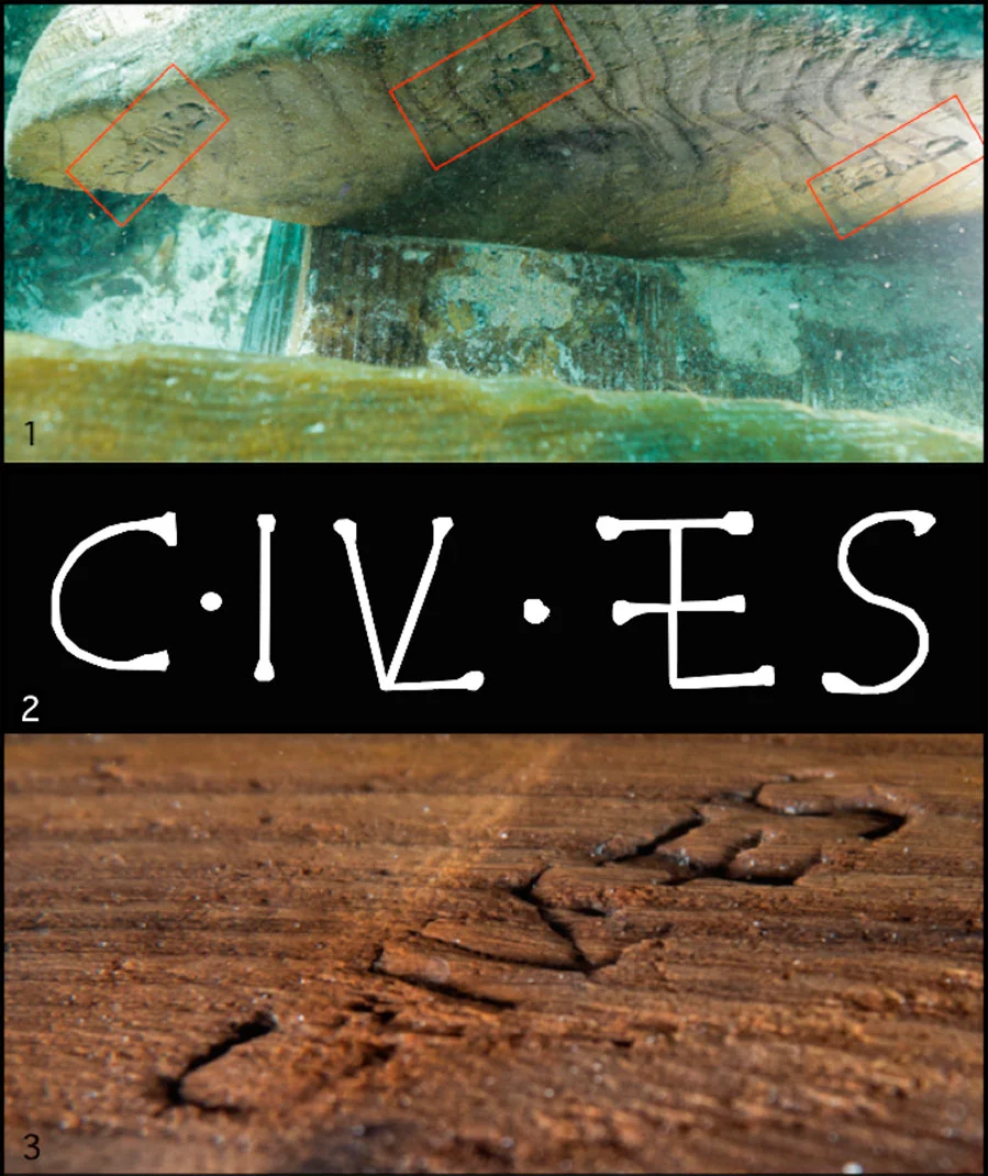 If we move now beyond the naval architecture of the ship (how the ship was built) and explore who build it and where. The strongest clue to the ship’s place of construction and the people behind it is a maker’s stamp burned four times into the west face of frame C-111: C•I(VL)•(TELE)S. This is likely as an abbreviated tria nomina —C(aius) Iul(ius) Teles(…)—applied with a hot signaculum (metallic stamp). Its hidden placement and repeated use point to a professional shipwright’s or yard mark rather than decoration or ownership mark. Epigraphic parallels make Telesphorus the most likely expansion of “Teles(…)”, a cognomen especially common in the regions of Lazio–Campania, with multiple attestations at Ostia (including a 1st-century inscription for a C. Iulius Telesphorus, domo Ravenna). It seems quite likely that this individual could have been a marine carpenter connected to a yard at Ostia/Ravenna. Therefore, is quite certain to argue that the hull of the Ses Llumetes ship was probably built in the Italic Peninsula, very likely somewhere in the Ostia–Lazio–Campania corridor; although this hypothesis is still awaiting confirmation.